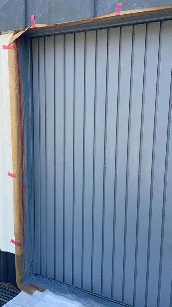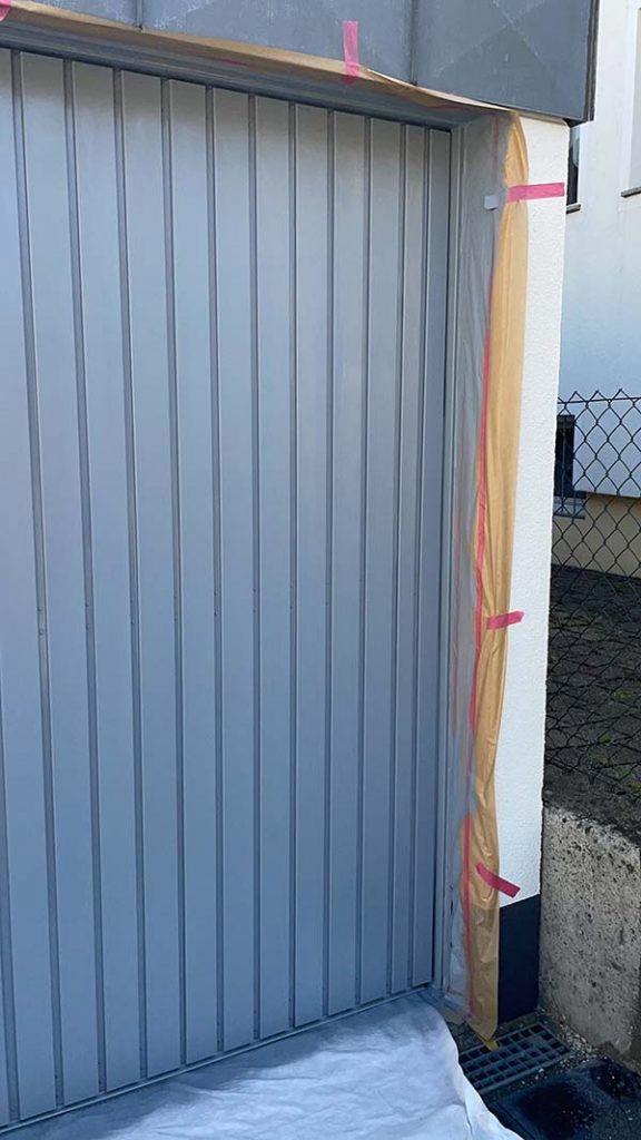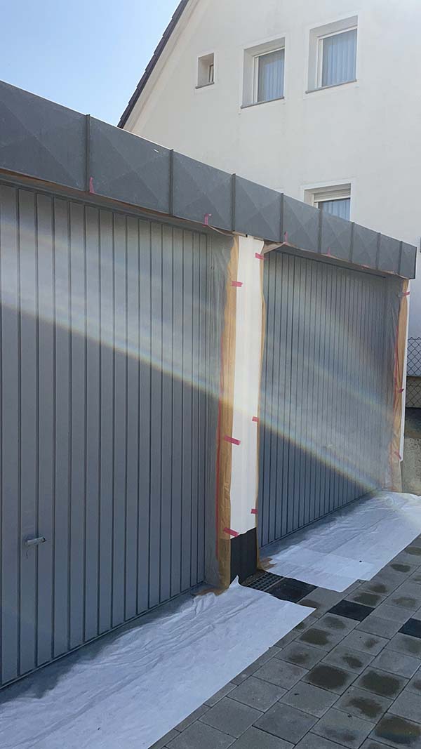 Garagentore wetterresistent erneuert: Die verzinkten Stahltore behandelte ich mit Rostschutzgrundierung und wetterbeständiger Schlussbeschichtung. Die neue Lackierung in anthrazit harmoniert perfekt mit der Hausfassade und bietet jahrelangen Korrosionsschutz.