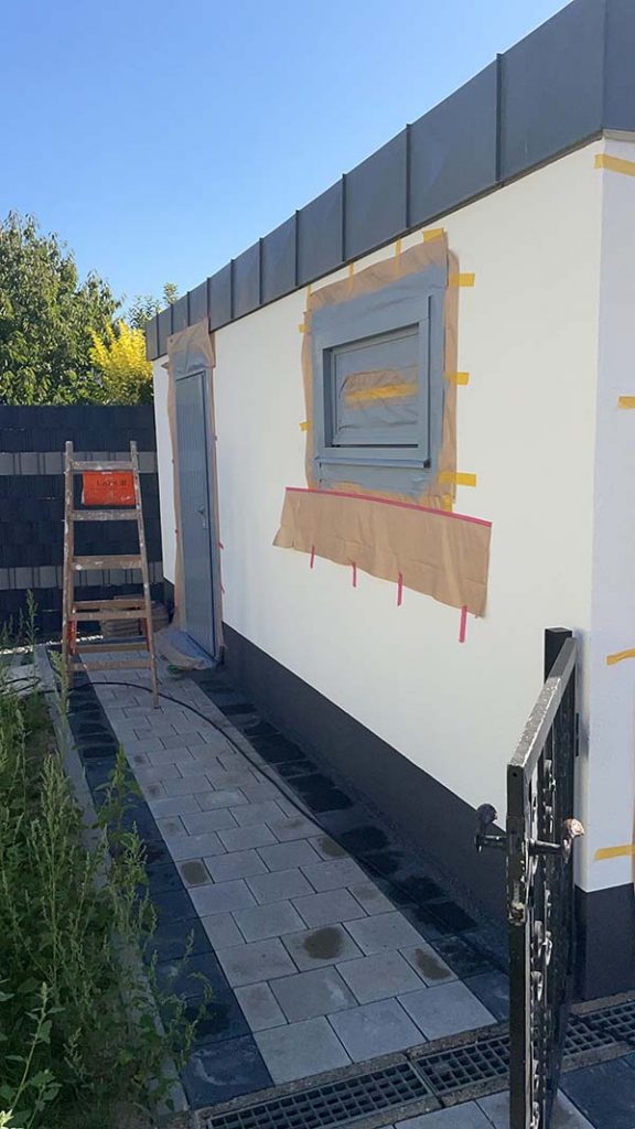 Nebeneingangstür funktional aufgewertet: Die Metalltür erhielt eine komplette Aufarbeitung: Abschleifen, Grundierung, zwei Lackschichten plus Klarlack-Versiegelung. Die neue RAL-Farbe fügt sich harmonisch ins Gesamtbild ein.